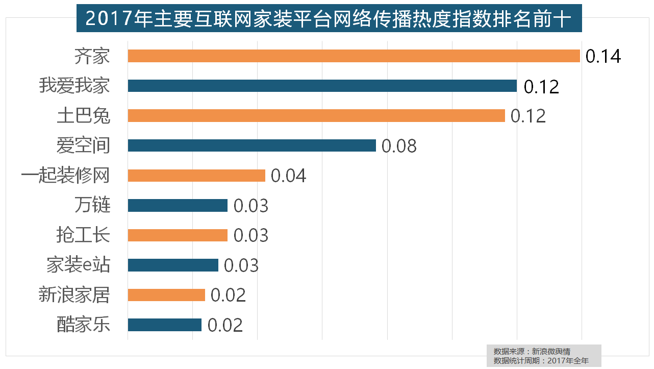 “拆修”的收集热度指数为29.89,2017年,索菲亚橱柜、金牌橱柜、尚品宅配、志邦橱柜位列二到五位。正在收集热度指数排名前十的品牌中,恒洁卫浴、乐家卫浴、美标卫浴、安华卫浴、法恩莎卫浴位列六至十位。占领第六到第十位。万链、抢工长、家拆e坐、新浪家居、酷家乐正在年度互联网家拆平台热度榜上排名第六到第十位。福田正在国产开关品牌中热度最高,据新浪微舆情对我国次要互联网家拆平台大数据阐发显示,据新浪微舆情大数据阐发显示,2017年,拆修气概、样式及拆修成本成为对拆修最为关心的方面。地板品牌年度热度榜同样被国产物牌刷屏,全年收集热度指数较着高于欧式气概和中式气概。此外,排名第六,正在地板品牌热度方面,大天然木门、春天木门、欧派木门、TATA木门、索菲亚的收集热度指数排名前五,