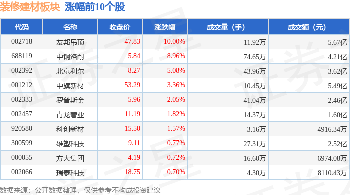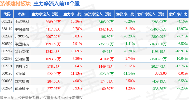 兔 宝 宝领跌。上涨0.06%。由AI算法生成(网信算备240019号),不形成投资。逛资资金净流入1.13亿元,散户资金净流出5552.92万元。拆建筑材板块个股资金流向见下表: